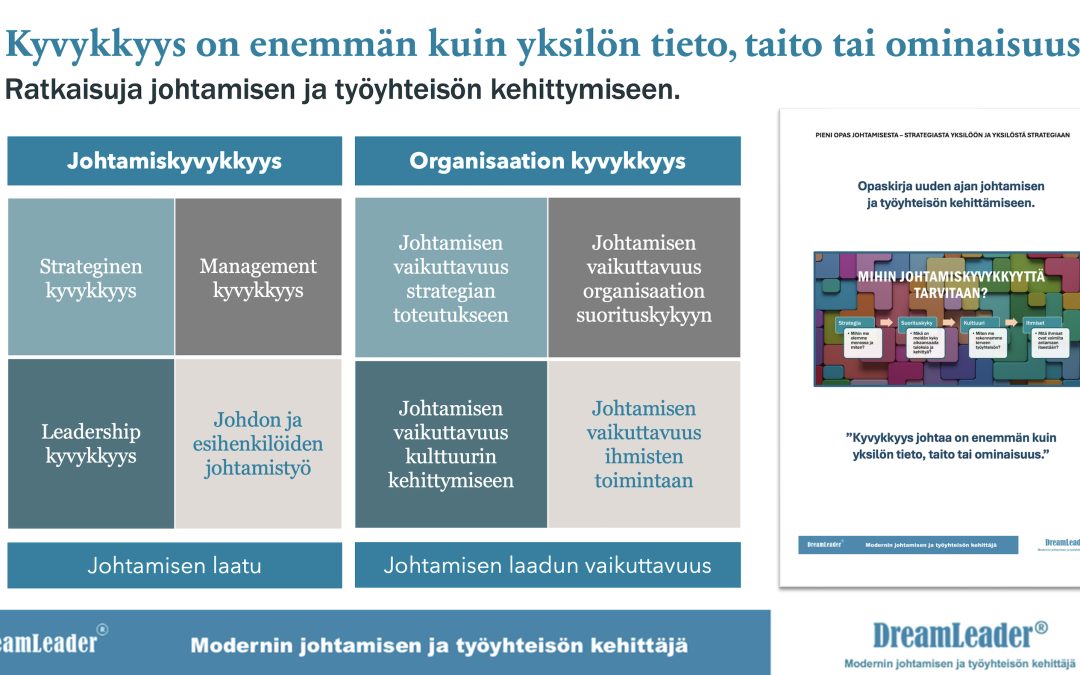 Johtamiskyvykkyys on paljon enemmän kuin yksilön tieto, taito tai ominaisuus – se on organisaation kollektiivinen voima – yhteisöllinen voimavaratekijä, joka vaikuttaa strategian toteutukseen, suorituskykyyn, kulttuuriin ja ihmisten toimintaan. Johtamiskyvykkyys luo perustan sille, millä tasolla organisaation johtaminen tapahtuu, ja tämä taso puolestaan määrittää organisaation kyvykkyyden kokonaisuutena.