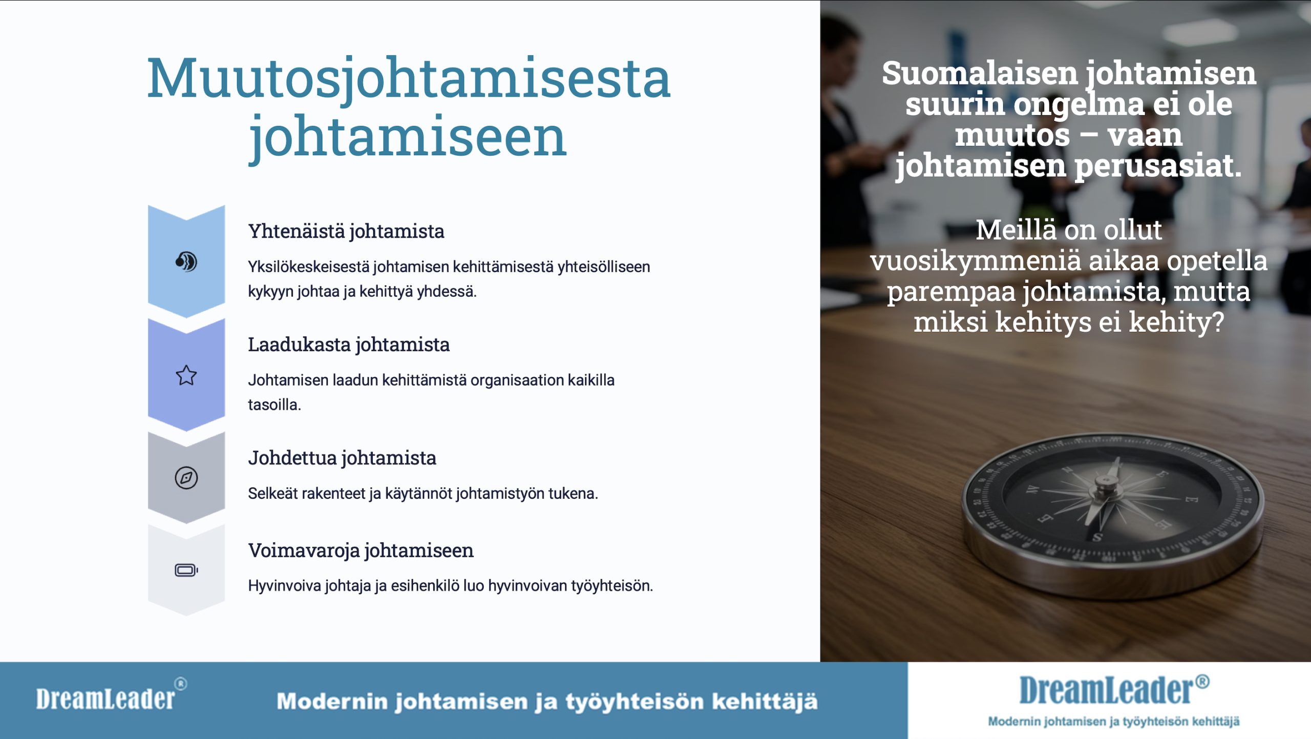 DreamLeaderin tapa kehittää johtamista on kaikkea muuta kuin tavanomainen koulutusohjelma tai valmennus.