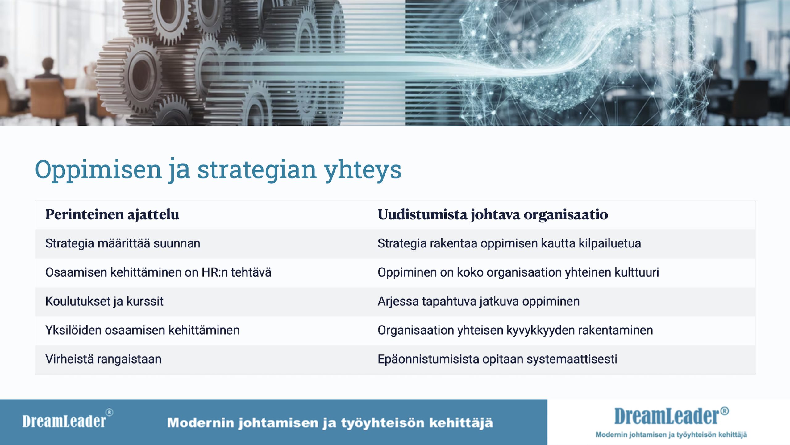 Tutustu oppimisen ja uudistumiskyvyn johtamiseen, kehittämiseen ja mittaamiseen.