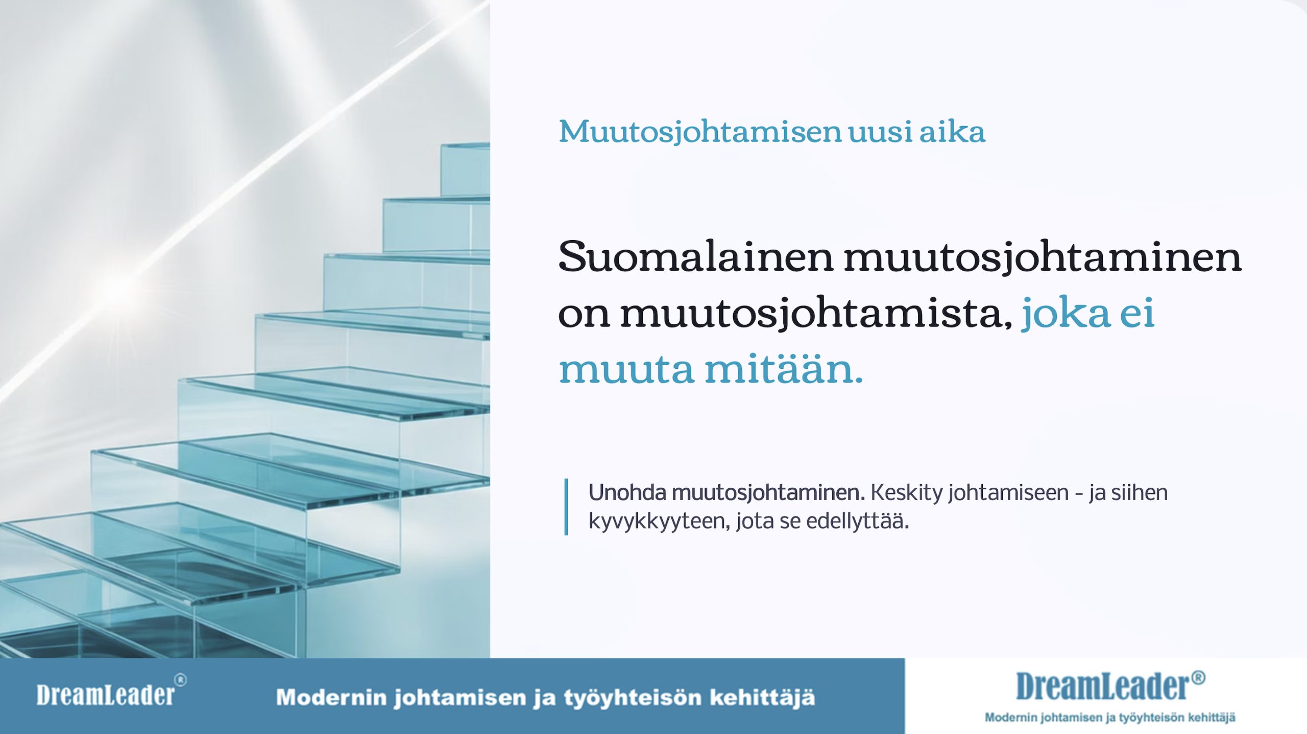 Haluatko uudistaa ajattelusi muutosjohtamisesta? Se, mitä Suomessa on ymmärretty muutosjohtamisena, ei ole koskaan ollut muutosjohtamista.